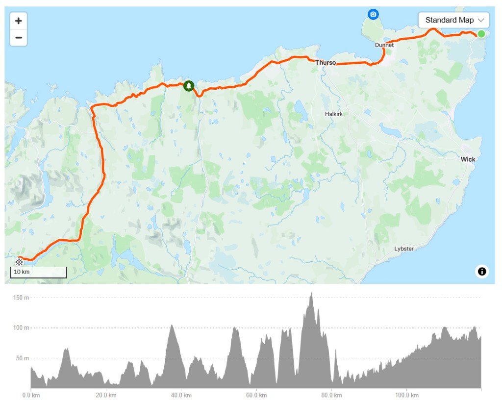 After arriving in John o’ Groats the day before, and staying at the local B&B, I should be well refreshed for Day 1. It looks like a stunning route along the rugged North Atlantic coast, with some sharp peaks, before wild camping overnight near Altnaharra in the Strathnaver Valley – population 70. Welcome to the Scottish Highlands!