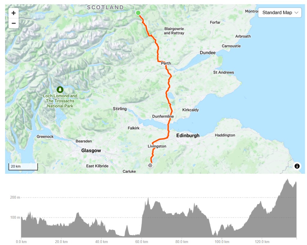 I’ve got a room booked in Pitlochry to look forward to. I expect a shower, bed and electric charging points will all be very welcome, 382km and 3400m elevation into the journey.