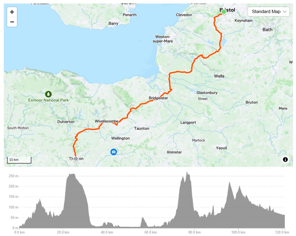 Only three days to go now, in theory! The day starts (unless I’ve gotten ahead on the previous days) through the stunning Cheddar Gorge, then over the Quantock Hills and into Devon. This is the last sensible opportunity to bank time before Cornwall gets spiky. If I’ve got the legs, I’ll try to push on.